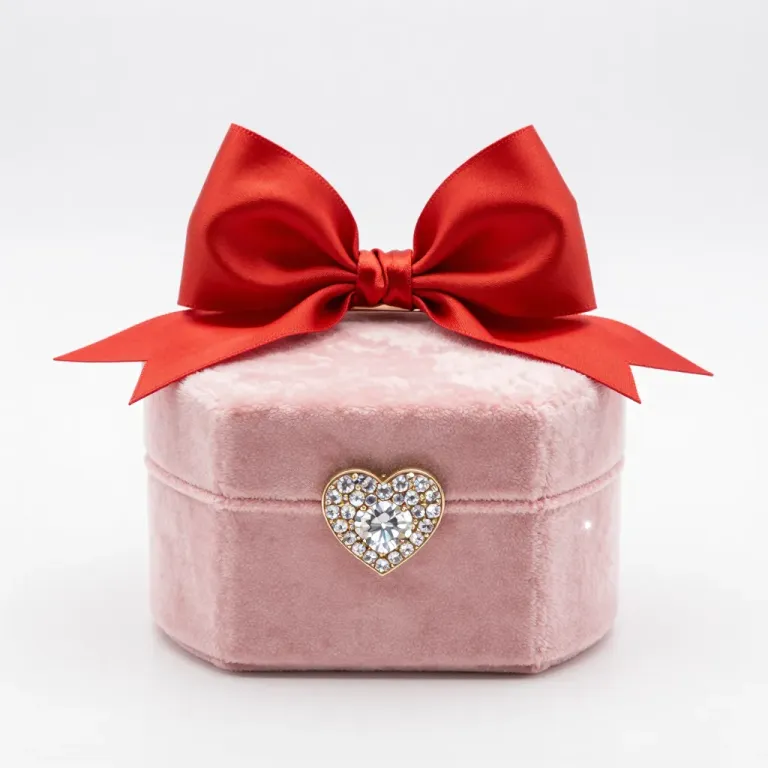 A soft pink velvet jewelry box adorned with a glossy red satin bow and a sparkling crystal heart brooch, illuminated by soft diffused light that highlights the textures and creates gentle shadows. The clean white background emphasizes the box, offering ample copy space for design purposes.
