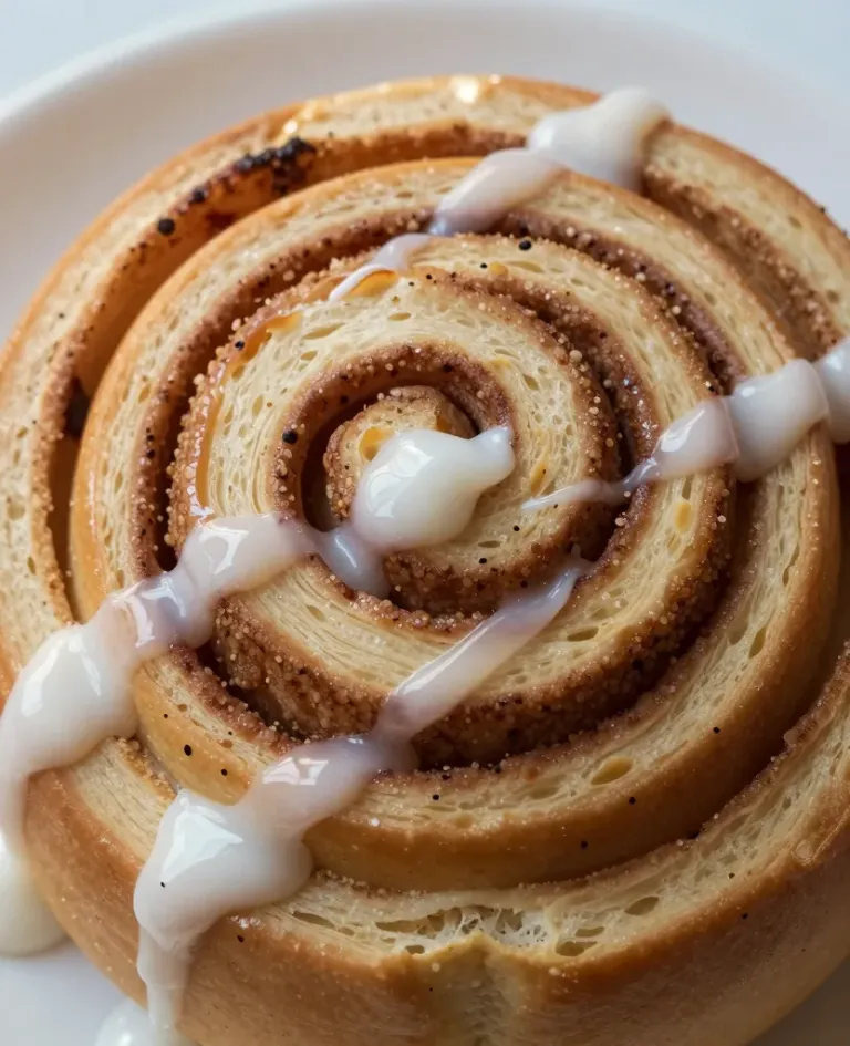 A close-up of a golden cinnamon roll with creamy icing drizzled over its swirl pattern, highlighted by warm top-down lighting that accentuates the glossy, sugary top and flaky texture. The blurred white plate background keeps the focus on the intricate pastry details.