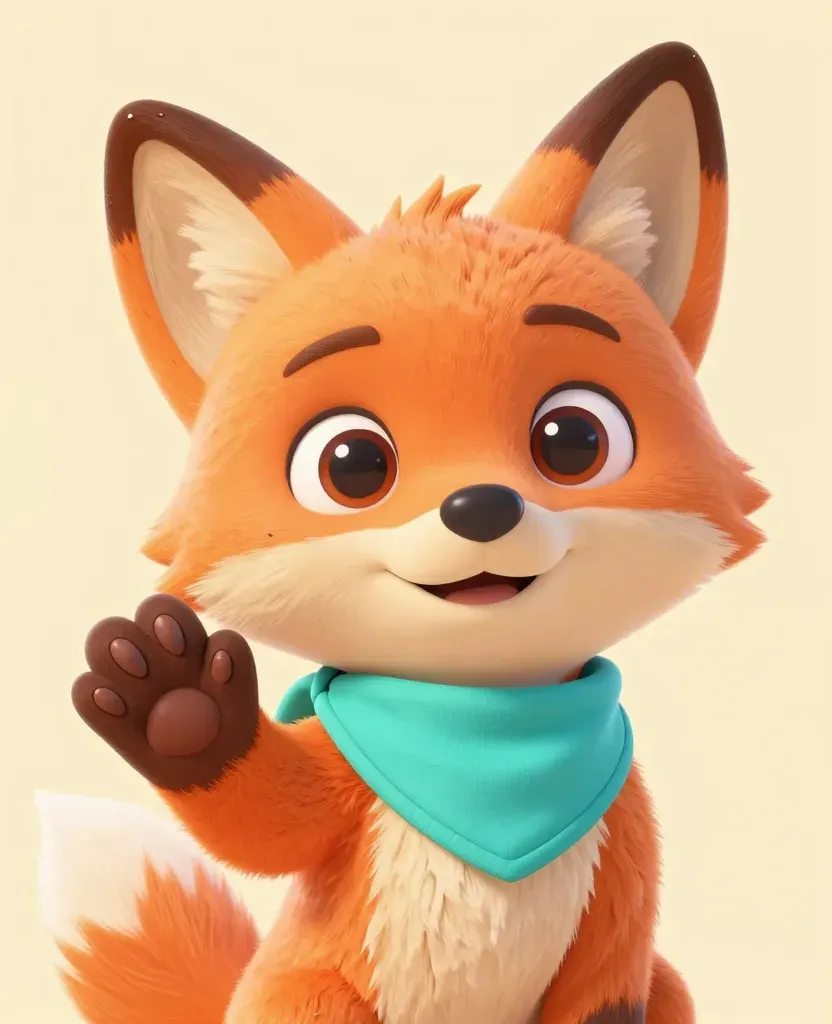 A close-up of a friendly fox pup waving with a teal bandana, set against a soft, even light that highlights the texture of its fur and the bandana. The minimal, neutral background ensures the subject remains the focal point.