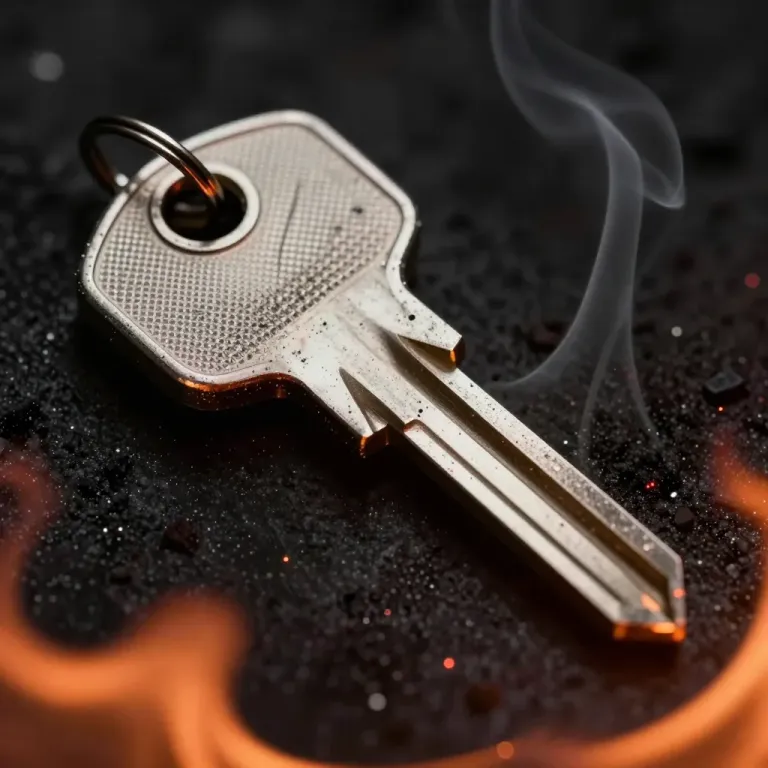 A metallic motorcycle key with a rough grid pattern glows under the warm, orange light of a fire, casting dramatic highlights on its surface. The dark, ash-covered ground and smoky atmosphere create a dramatic, moody backdrop.