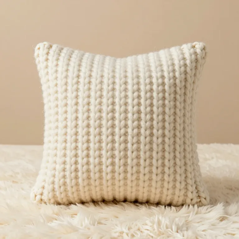 A close-up of a soft, textured knit pillow in neutral beige tones, illuminated by diffused, warm lighting that creates a cozy, inviting atmosphere. The shallow depth of field and blurred background highlight the pillow's tactile details and create a sense of depth and focus.