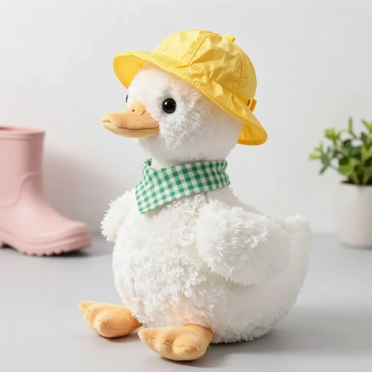 A soft, fluffy white plush duck adorned with a glossy yellow bucket hat and a green and white checkered scarf, illuminated by soft, diffused light that highlights its texture and creates gentle shadows. The minimalistic background, featuring a pink boot and a potted plant, adds depth and context to the image, making it suitable for various design applications.