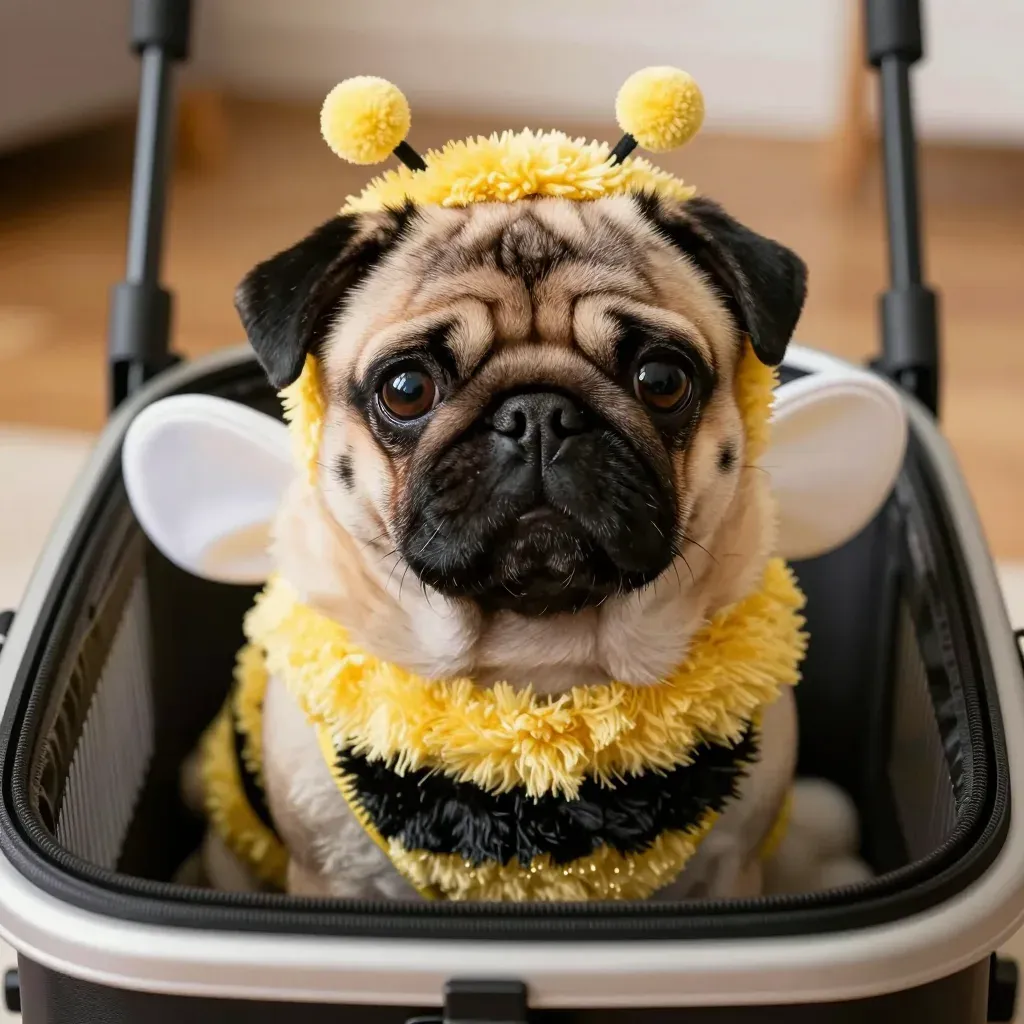 A wrinkled pug in a fuzzy yellow and black bee costume sits in a stroller, bathed in soft, natural light that highlights its features and the texture of the costume. The shallow depth of field keeps the focus on the pug, with a blurred indoor background suggesting a cozy home setting.
