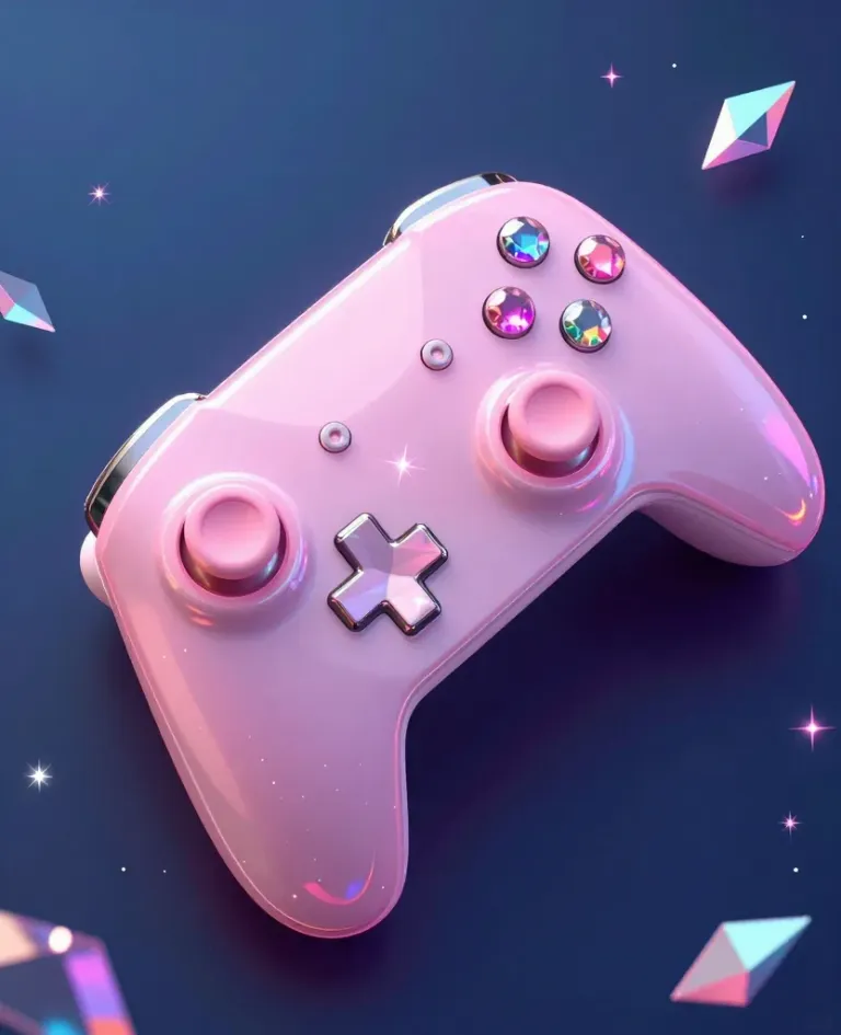A glossy, smooth, liquid-like iridescent game controller adorned with gemstones, set against a starry, cosmic background with floating gemstones, creating a dreamy, high-end aesthetic. The soft, directional lighting highlights the controller's reflective surface, emphasizing its luxurious and playful design.
