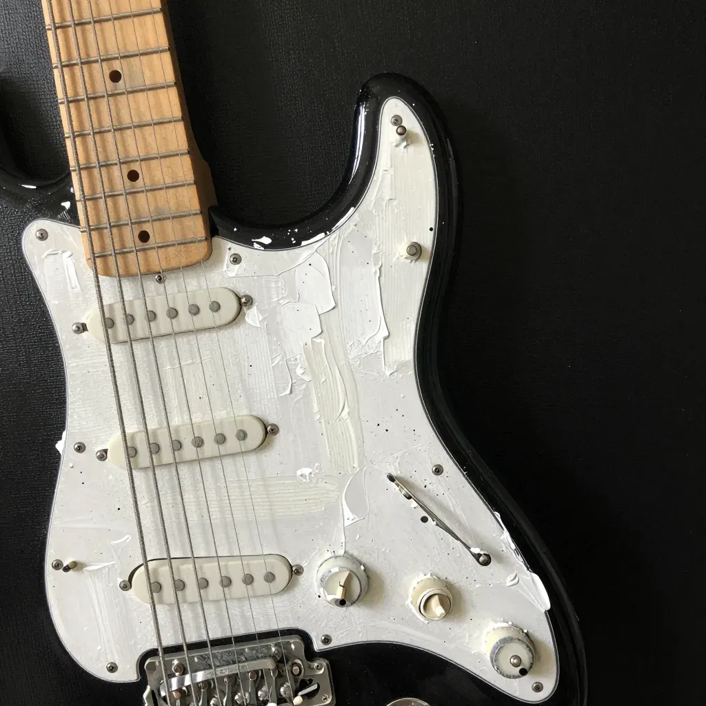 A close-up of a glossy white electric guitar with chipped paint, highlighting the natural wood of the fretboard and smooth plastic pickguard. Direct lighting creates reflections on the strings and body, emphasizing the texture and details of the guitar against a dark, blurred background.