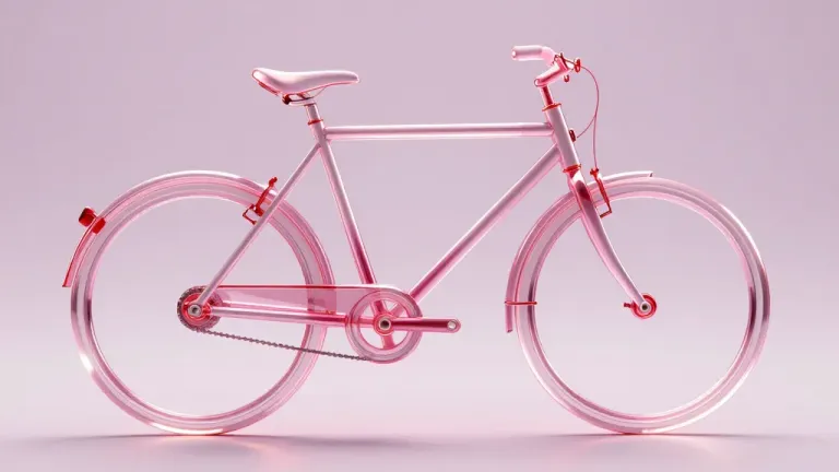 A side profile of a glossy, translucent pink bicycle model with subtle ambient lighting and soft gradients. The composition is centered and close-up, with a plain light pink gradient background that enhances the bicycle's reflective surfaces.
