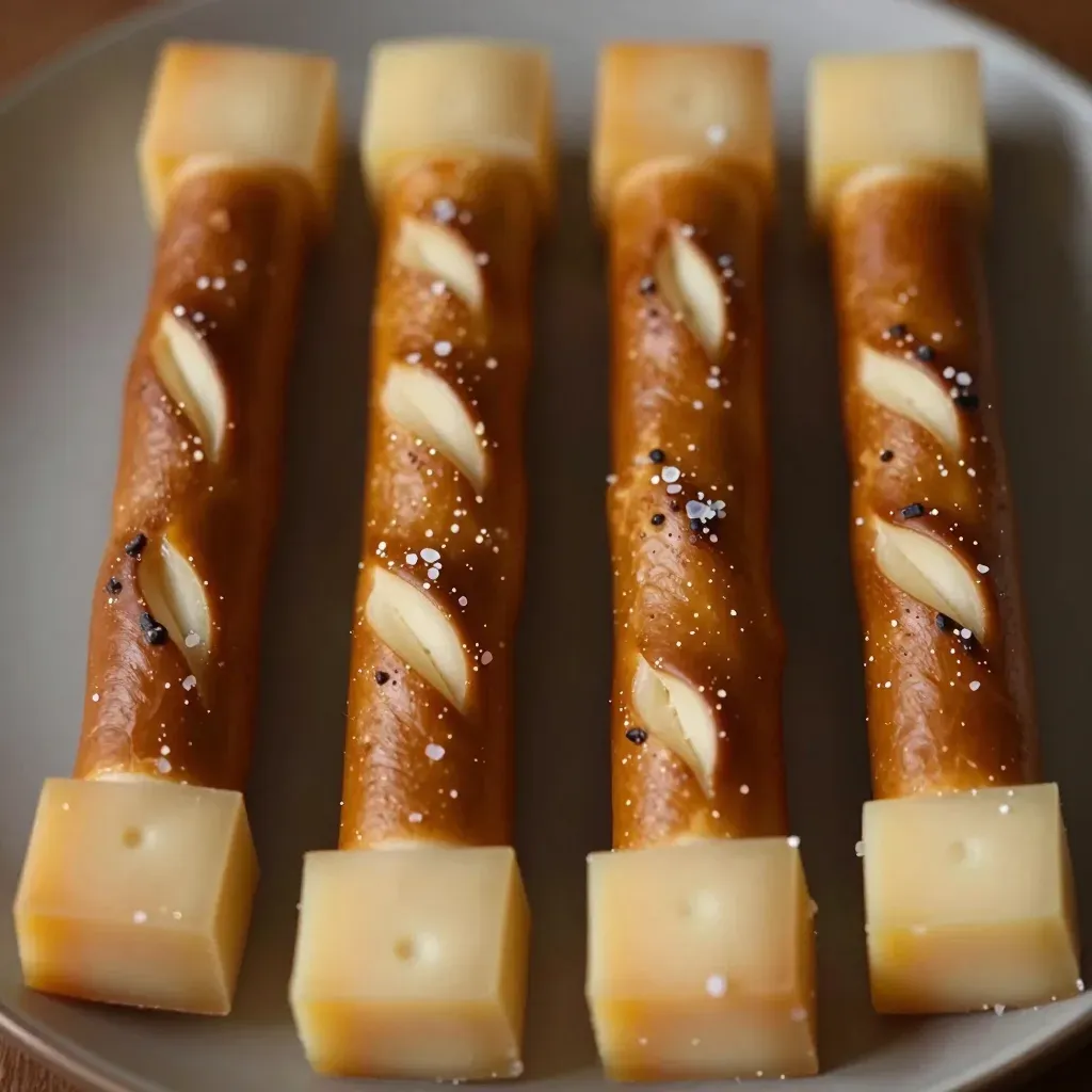 Close-up of golden brown pretzel cheese twists with creamy white cheese, crunchy almonds, and coarse salt, softly lit to highlight glossy texture and shallow depth of field.
