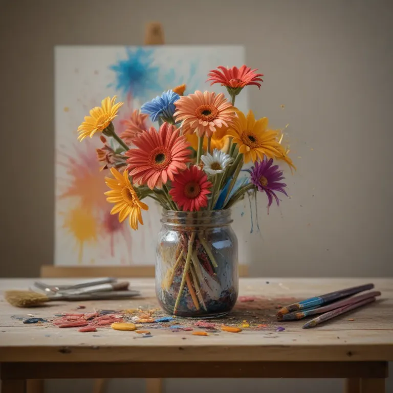 A vibrant bouquet of gerbera daisies in a glass jar, set against a backdrop of abstract paint splashes, creating a warm and artistic ambiance. The diffused lighting and soft shadows enhance the texture of the petals and the glossy finish of the glass, while the slightly blurred background draws attention to the bouquet.