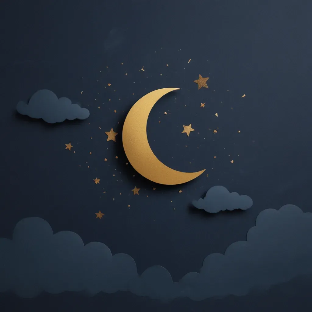A serene night scene featuring a glossy crescent moon surrounded by glittery stars, with soft, fluffy clouds framing the bottom. Subtle ambient light enhances the tranquil, dreamy atmosphere.