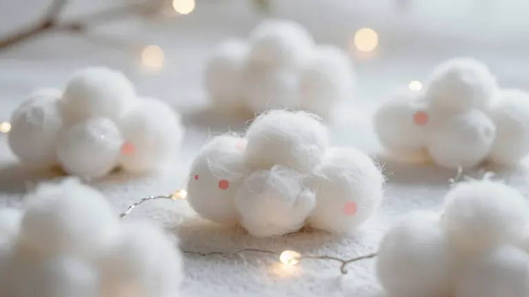 Close-up of fluffy cotton balls with a soft, slightly rough texture, illuminated by warm, golden bokeh lights, creating a cozy and festive atmosphere. The shallow depth of field draws attention to the cotton balls, leaving the background blurred and dreamy.
