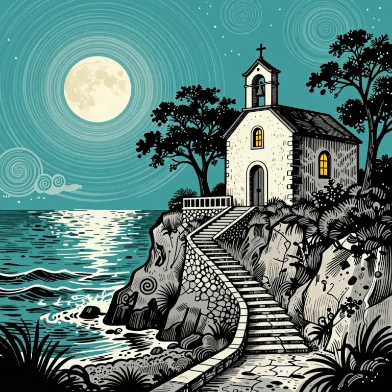 A serene seaside chapel with stone steps leading up to it, bathed in the soft glow of moonlight and reflected on the calm sea. The composition leads the viewer's eye from the foreground steps to the chapel, creating a sense of depth and tranquility.