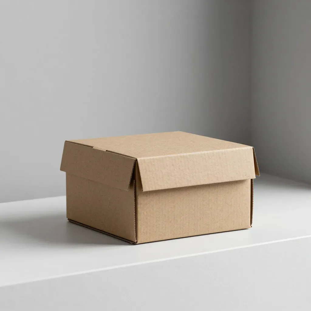 A rough, natural brown kraft paper box with slightly worn edges sits on a white surface under soft, diffused lighting, creating gentle shadows. The neutral gray background provides a clean and unobtrusive backdrop, emphasizing the box's texture and form.