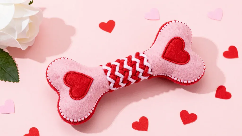 A soft pink felt dog bone toy featuring red hearts and a braided red-and-white fabric center rests on a pale pink surface, accompanied by scattered paper hearts and a white rose with a green leaf. The soft, diffused overhead lighting creates gentle highlights on the braided section and rose petal, while the shallow depth of field emphasizes the toy against a clean, romantic background with ample copy space.