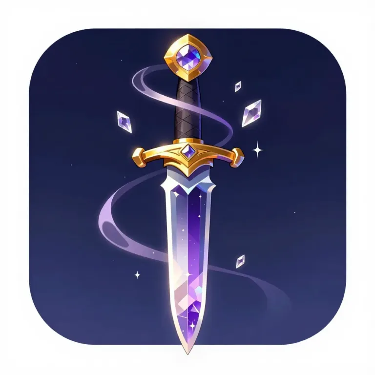 A crystal dagger with a gold hilt and gemstone floats against a starry night sky, with starlight reflecting off its glass blade and soft glow emanating from the gemstone. The composition is centered with floating gemstones and starlight streaks, creating a sense of depth and ethereal beauty.