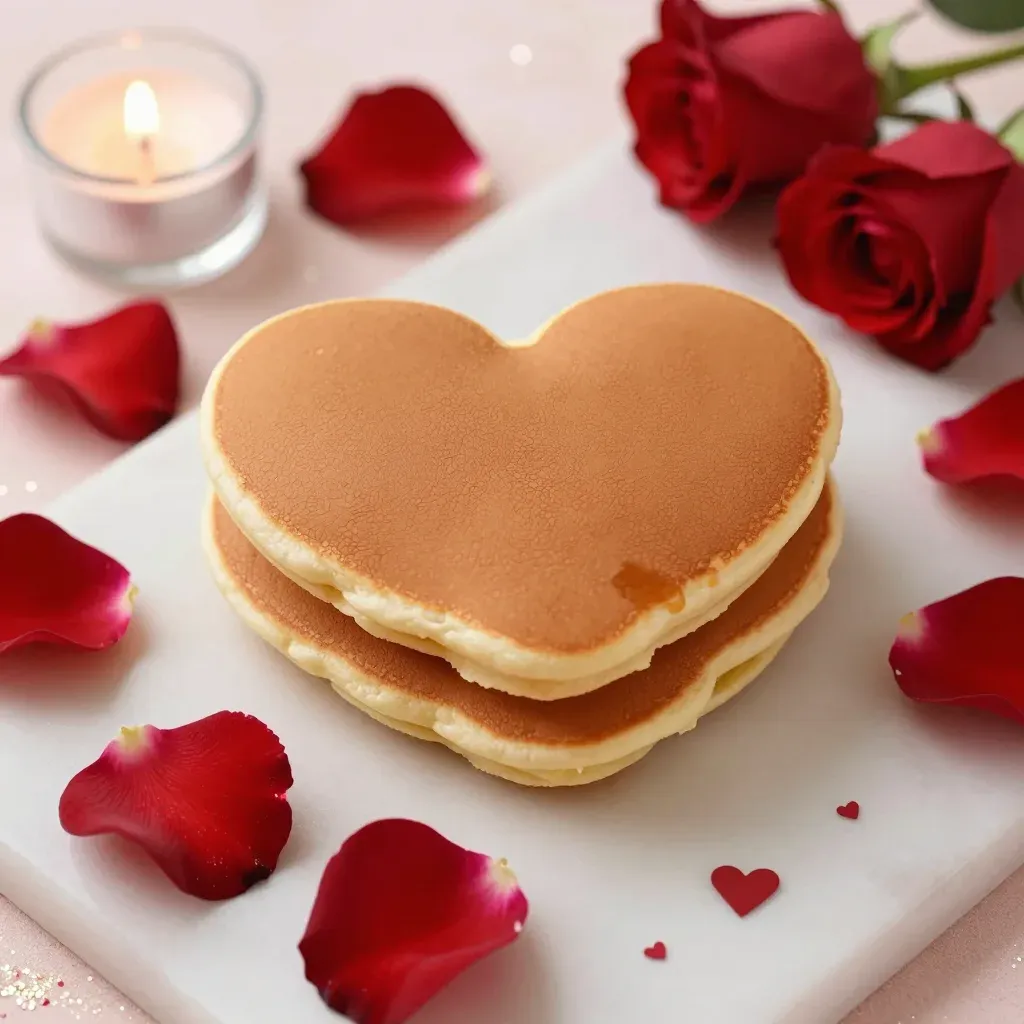 Golden-brown heart-shaped pancakes with glossy syrup drizzle, softly lit by a candle, creating a romantic ambiance with red rose petals and small hearts in the background. Shallow depth of field focuses on the pancakes, leaving the background slightly blurred.