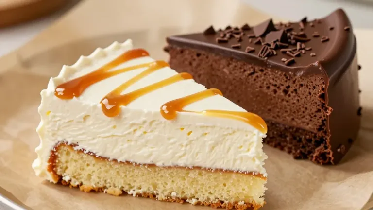 A close-up of a slice of cheesecake topped with caramel drizzle and a slice of chocolate cake with chocolate shavings, both illuminated by soft, diffused light that highlights the glossy textures and creates subtle shadows, enhancing the depth and focus on the desserts against a simple, warm, and slightly blurred background.