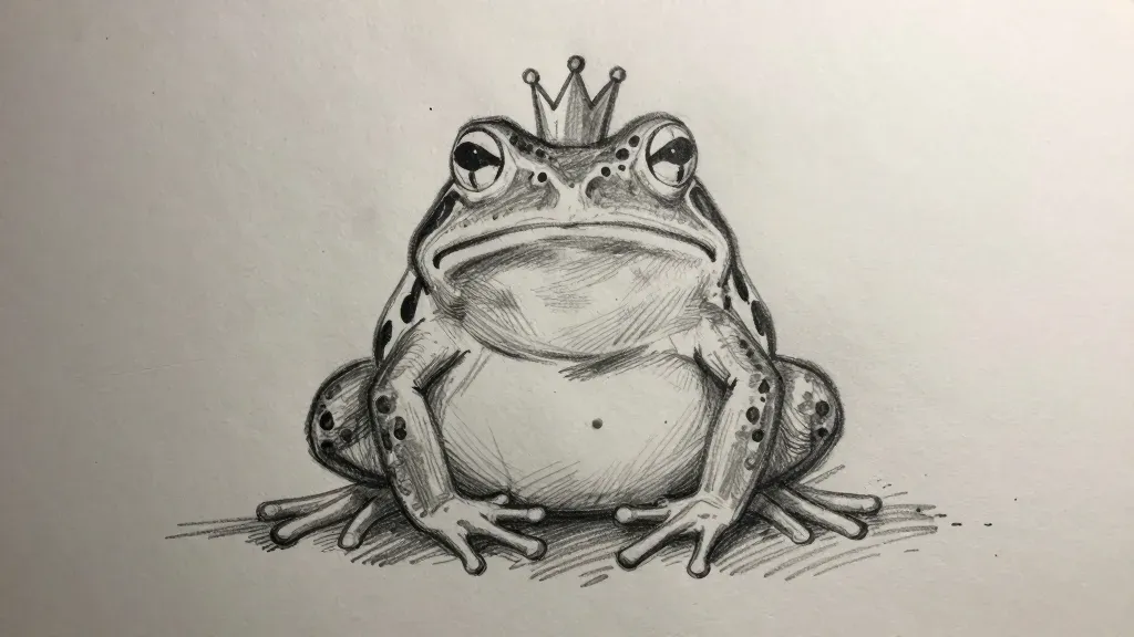 A detailed pencil drawing of a frog crouching with a glossy crown, highlighting its rough, bumpy skin under soft, diffused lighting. The shallow depth of field and neutral gray background emphasize the subject's intricate textures and details.