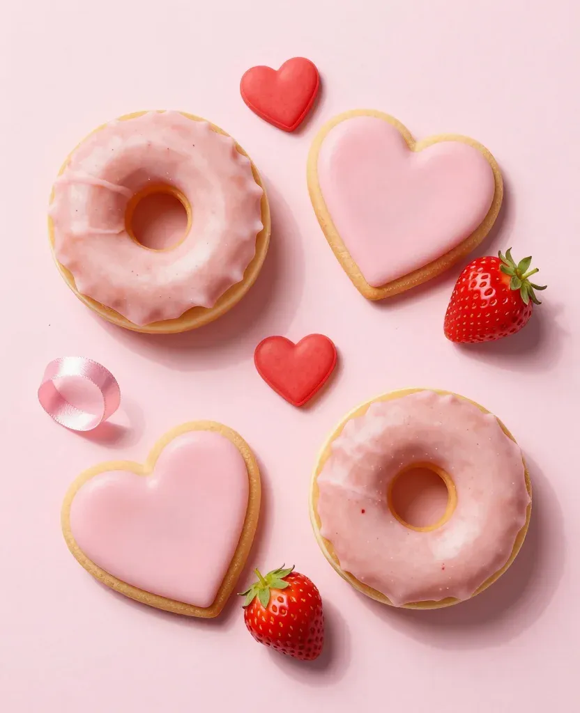 A symmetrical arrangement of pink donuts and heart-shaped cookies with fresh strawberries, highlighted by soft, diffused lighting that creates gentle highlights and soft shadows, set against a clean, solid pink background.