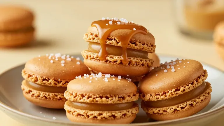 Golden brown macarons with glossy caramel sauce and coarse salt, softly lit to highlight texture and details. The shallow depth of field and neutral background create a clean and focused foreground, ideal for food and dessert imagery.