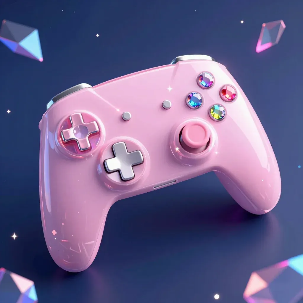 A glossy, iridescent pink game controller with gemstone buttons is showcased against a starry night sky, highlighting its vibrant colors and smooth texture. The soft, diffused lighting emphasizes the controller's design and details, creating a visually striking image with ample copy space.