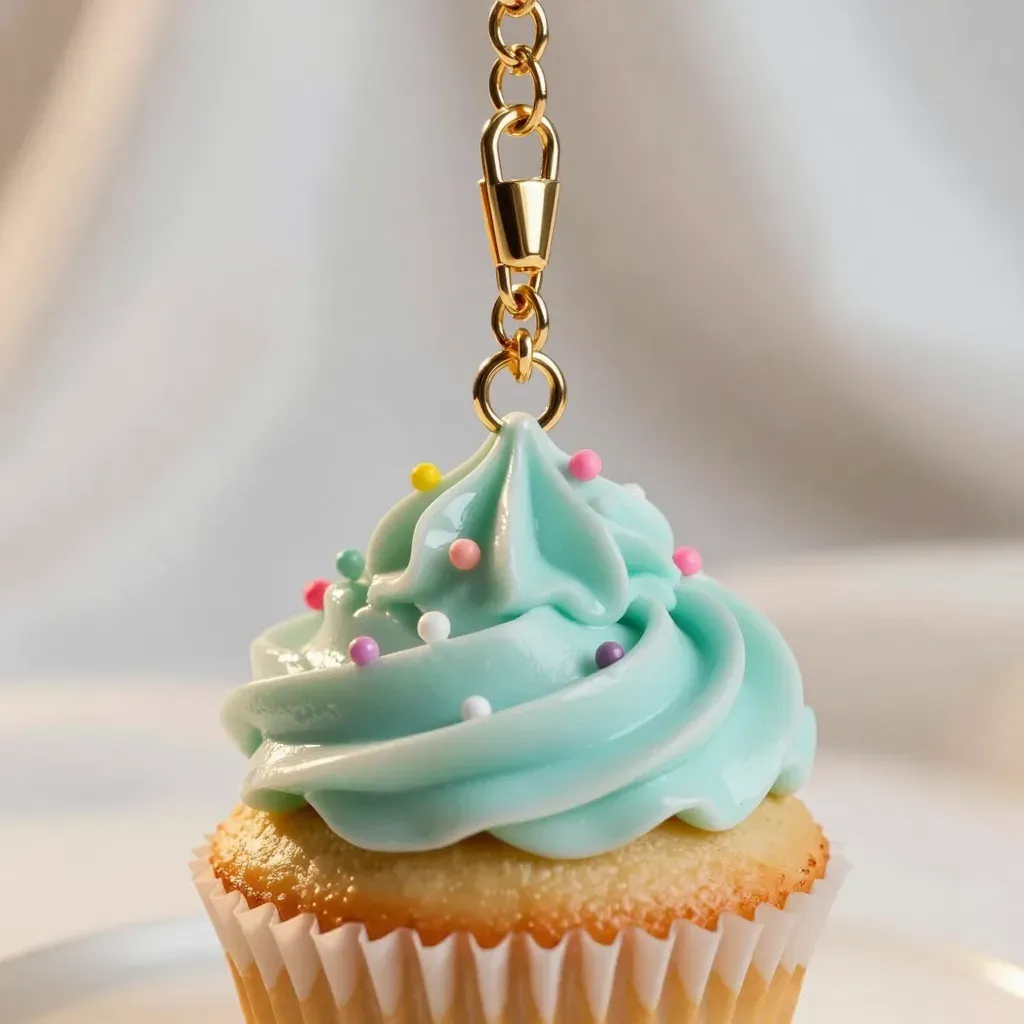A close-up of a turquoise frosted cupcake pendant adorned with colorful sprinkles, illuminated by soft, diffused light that highlights the glossy texture and creates gentle shadows, with a shallow depth of field blurring the neutral, light beige background to emphasize the pendant.