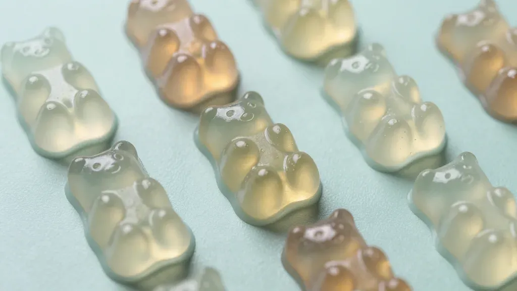Translucent yellowish-gold gummy bears shaped like small animals, highlighted by soft, diffused lighting that accentuates their glossy texture and three-dimensional form. The shallow depth of field and clean, blurred background provide a focused and elegant presentation.
