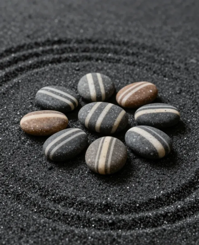 A cluster of smooth pebbles with white stripes rests on a dark textured sand background, softly lit to highlight the pebbles and create subtle shadows. The slightly off-center arrangement and shallow depth of field emphasize the pebbles against the dark sand, creating a serene and minimalist composition.