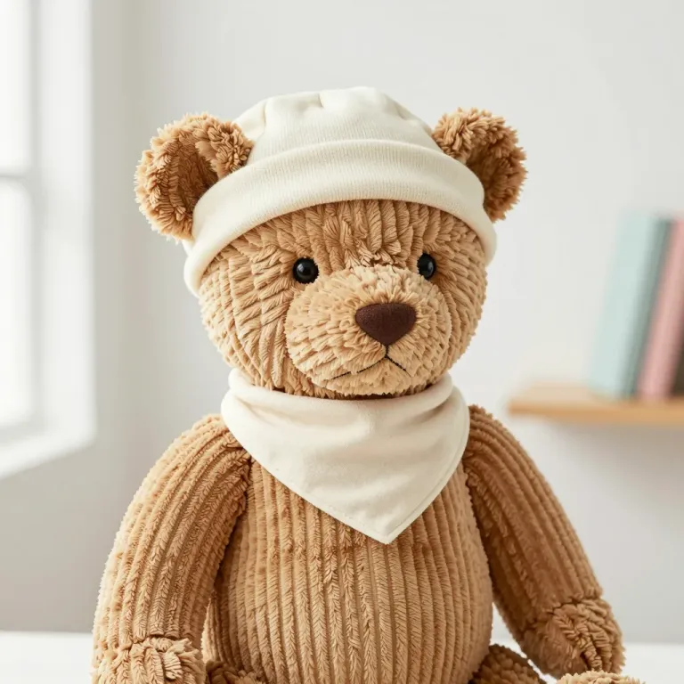 A soft, plush teddy bear wearing a textured corduroy beanie and scarf, bathed in soft, natural light that creates gentle shadows and highlights. The close-up, centered composition with a shallow depth of field and blurred background of a light-colored room with books and a wooden shelf offers ample copy space for design purposes.