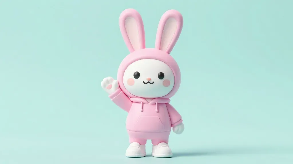A cute anthropomorphic bunny mascot in a plush pink hooded onesie waves cheerfully, its smooth white face and paws contrasting with the soft, glossy fabric. Soft front-left lighting creates gentle highlights and a shallow depth of field isolates the subject against a clean mint green gradient background.