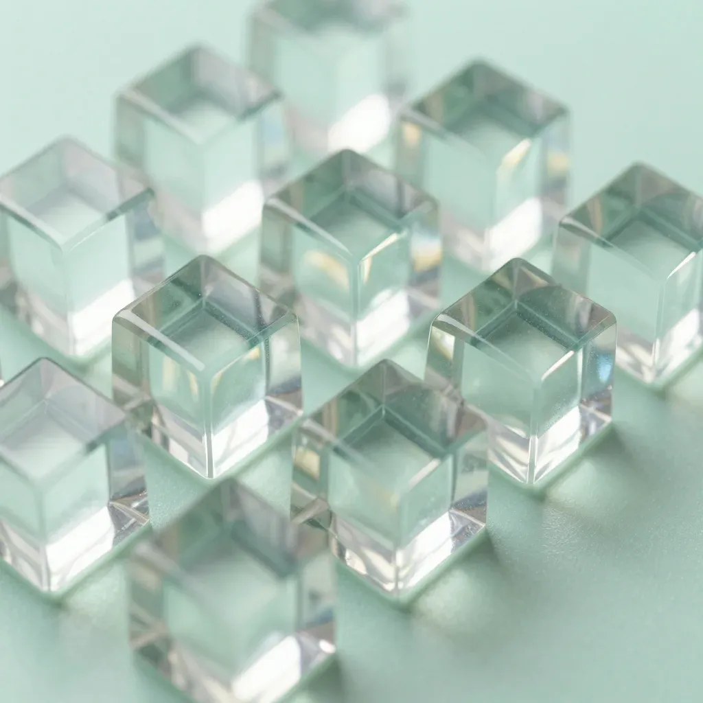 Soft, glossy, translucent jelly cubes emit a dreamy, ethereal glow, creating a serene and ethereal atmosphere. The shallow depth of field and clean background provide ample copy space for design integration.