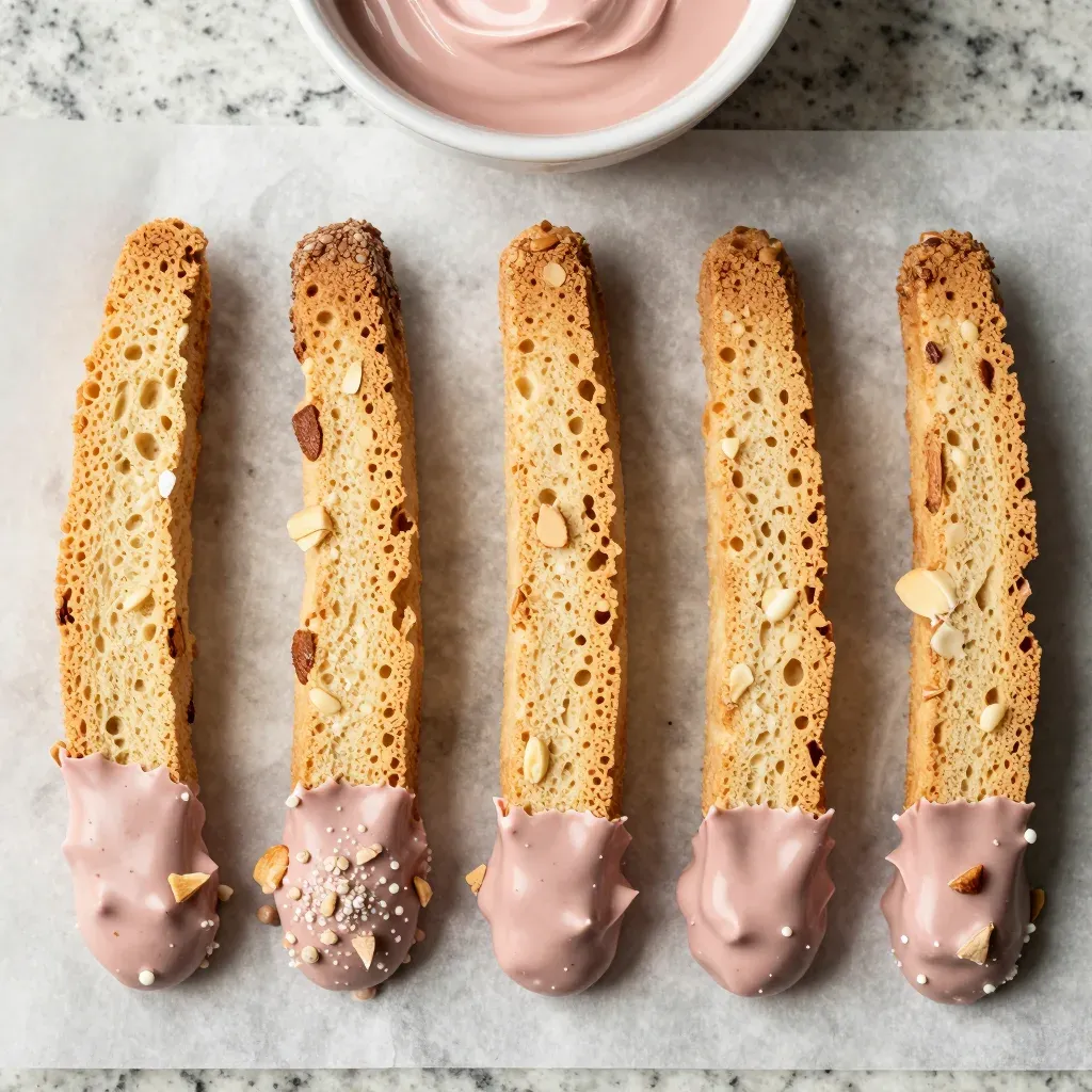 Golden-brown biscotti with crunchy almond slivers are artfully dipped in smooth, glossy chocolate sauce, highlighting their porous texture and the soft, diffused lighting that enhances the visual appeal. The neutral marble countertop background provides a clean, minimalist setting, ideal for product photography and food styling.