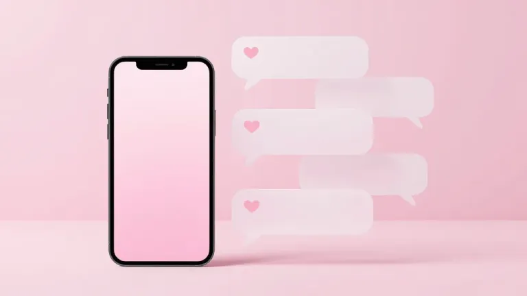 A glossy black-framed smartphone with a blank screen is surrounded by translucent heart-shaped speech bubbles, set against a soft pink gradient background. Subtle diffused lighting highlights the phone and speech bubbles, creating a sense of depth and a romantic, minimalist aesthetic.