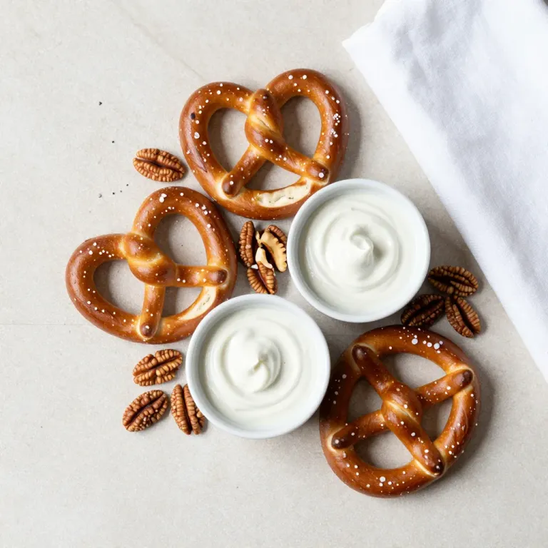 Glossy pretzels with pecans and creamy sauce are arranged in a flatlay, highlighting their textures and the soft, diffused lighting that creates gentle shadows and highlights. The neutral beige background provides a clean and unobtrusive backdrop, emphasizing the food's appeal and simplicity.