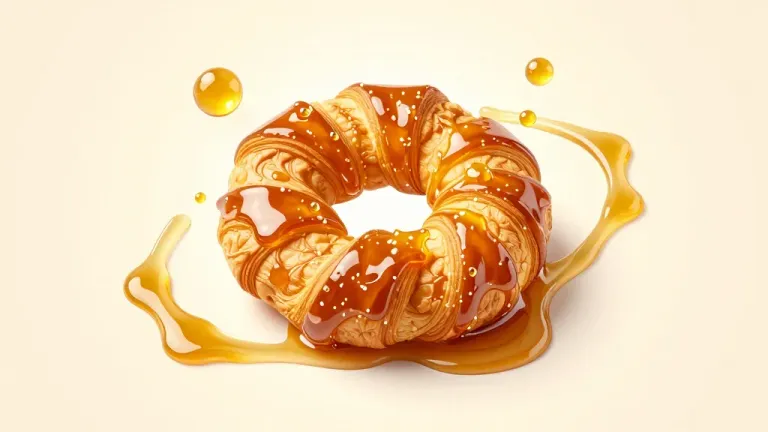 A glossy honey coating envelops a flaky cruller, with syrupy drips and splashes adding dynamic movement. Soft, diffused lighting highlights the texture and syrupy details against a minimalist creamy white background.
