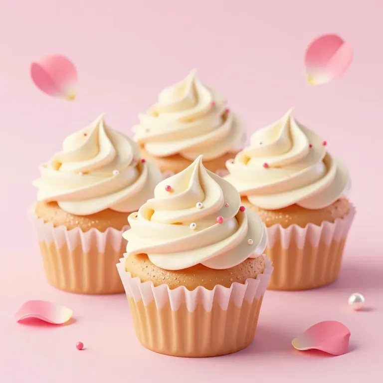 Softly frosted cupcakes with delicate sprinkles are arranged in a centered close-up, highlighting their glossy wrappers and creamy texture against a dreamy pink backdrop with floating petals. The shallow depth of field and diffused lighting create a serene and inviting atmosphere.