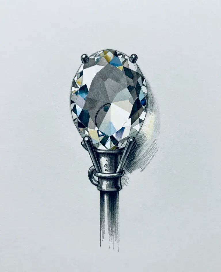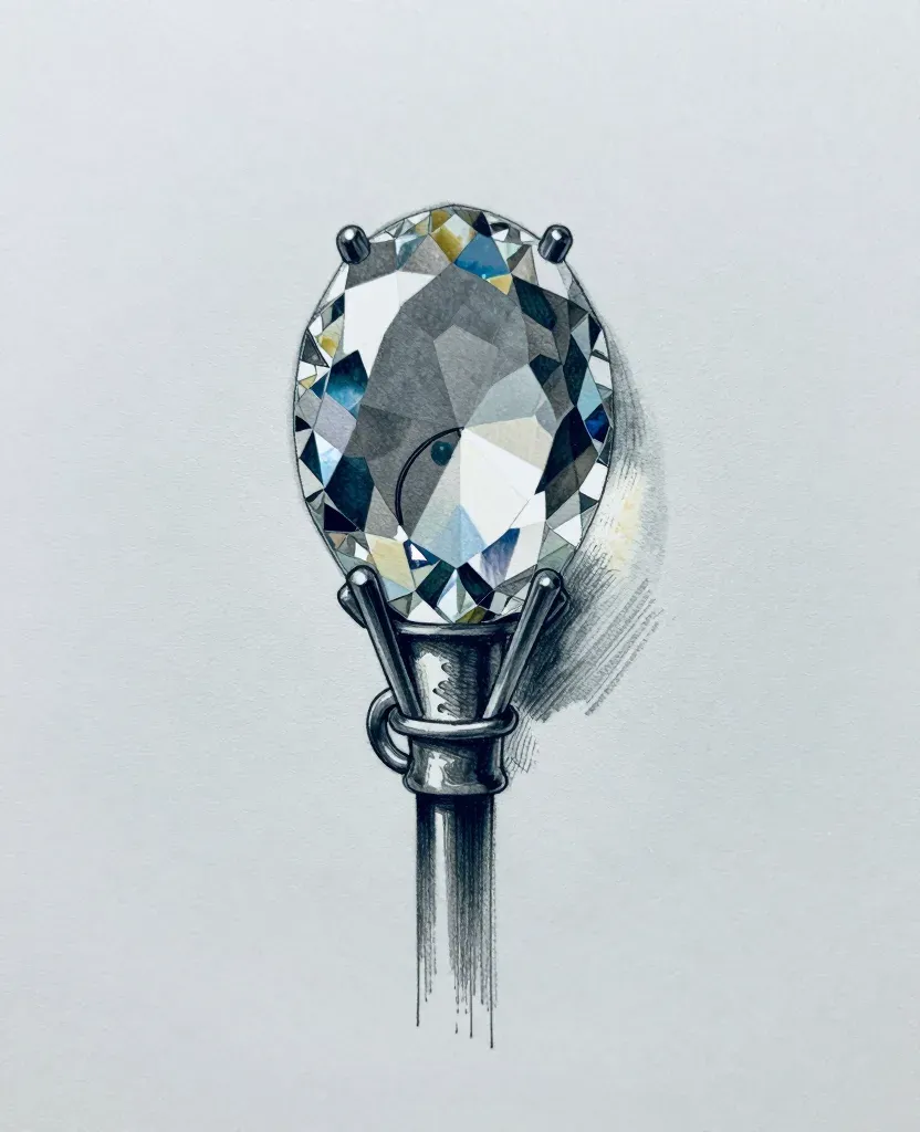 A crystal staff head gleams with facets of blue and yellow, set against a polished metal staff, all under soft, diffused lighting that highlights the intricate details and casts subtle shadows. The neutral, light gray background ensures the focus remains on the staff and crystal, creating a sense of balance and stability.