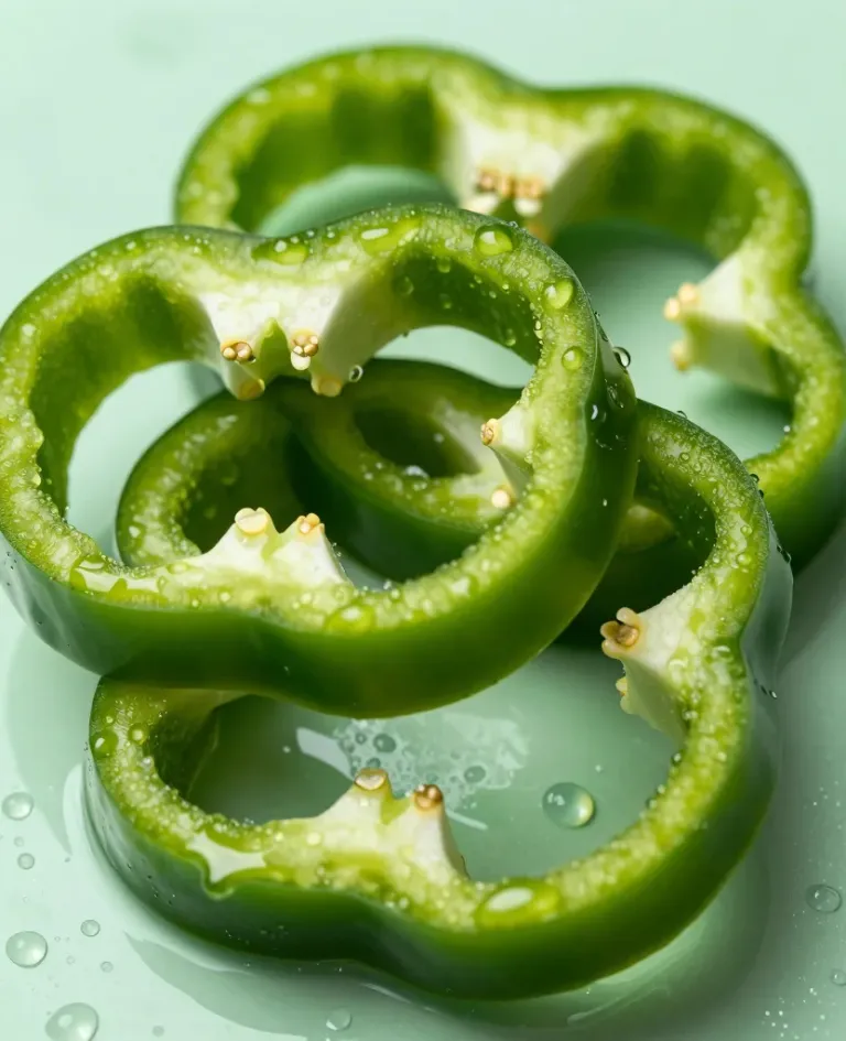 Overlapping rings of fresh green bell pepper glisten with moisture, showcasing glossy skin, crisp inner flesh, and translucent seeds. Soft diffused lighting highlights curved edges and water droplets, with a shallow depth of field isolating the subject against a smooth, out-of-focus light green background.