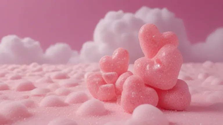 Close-up of heart-shaped candies with a fine sugar coating, glistening under soft pink light, creating a dreamy, cloud-like effect in the background. The shallow depth of field and diffused lighting emphasize the texture and glossy finish of the candies, making it ideal for use in food and confectionery marketing.