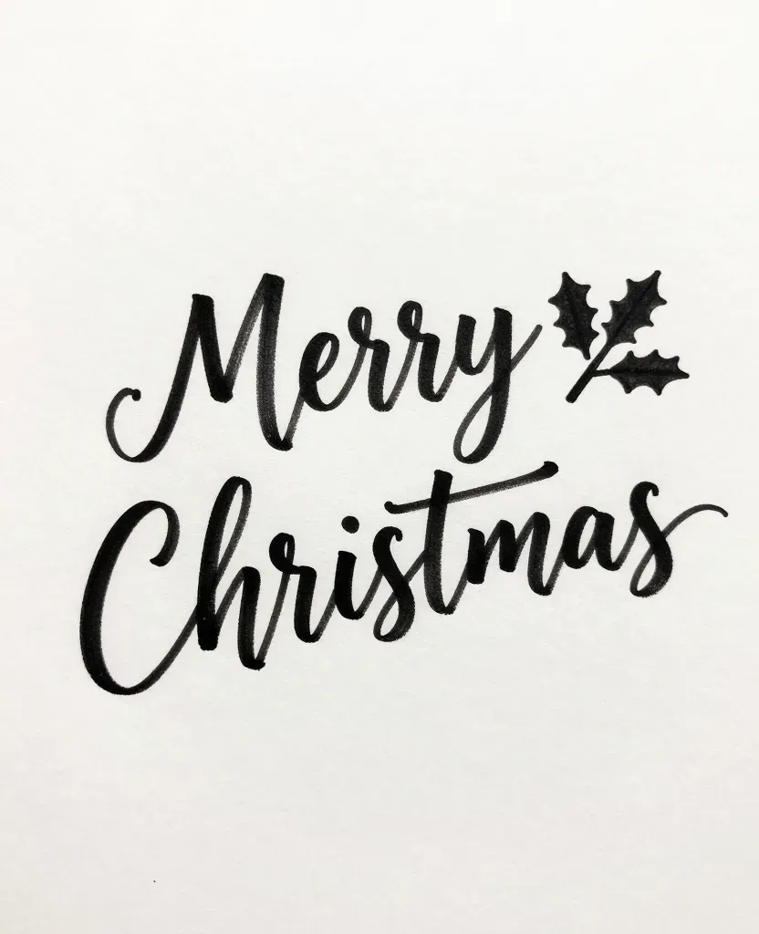 A smooth, glossy black ink script of 'Merry Christmas' with subtle green holly leaves, set against a clean white background. The even, soft lighting highlights the elegant calligraphy and festive details, making it ideal for holiday greeting cards and festive designs.