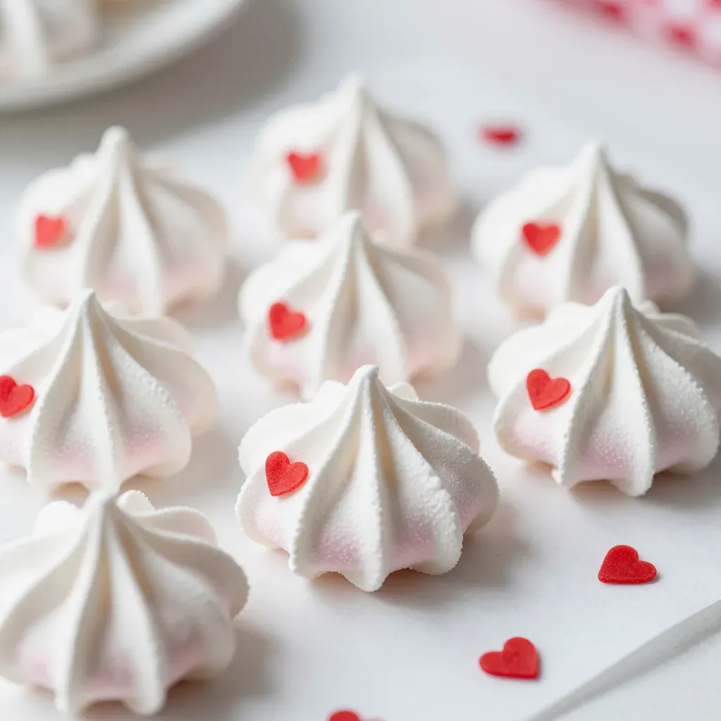 Swirled meringue kisses adorned with red heart sprinkles, bathed in soft, diffused light that highlights their light, airy texture and creates subtle shadows. The shallow depth of field and centered composition provide a clean, focused view of the delicate dessert, ideal for culinary and food photography.