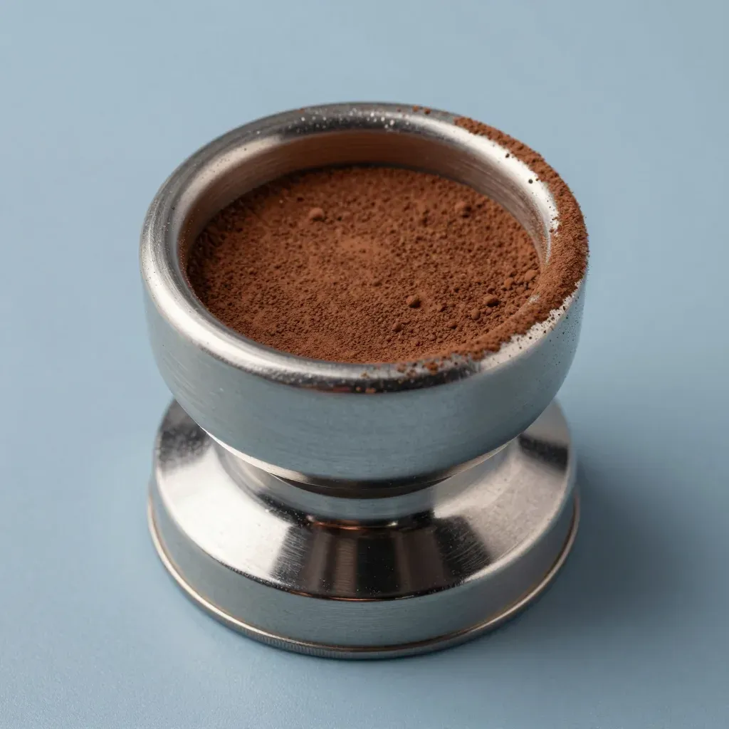 Fine grind coffee grounds compacted in a metallic tamper under soft, diffused lighting, emphasizing texture and sheen. The shallow depth of field and clean background highlight the subject's details.