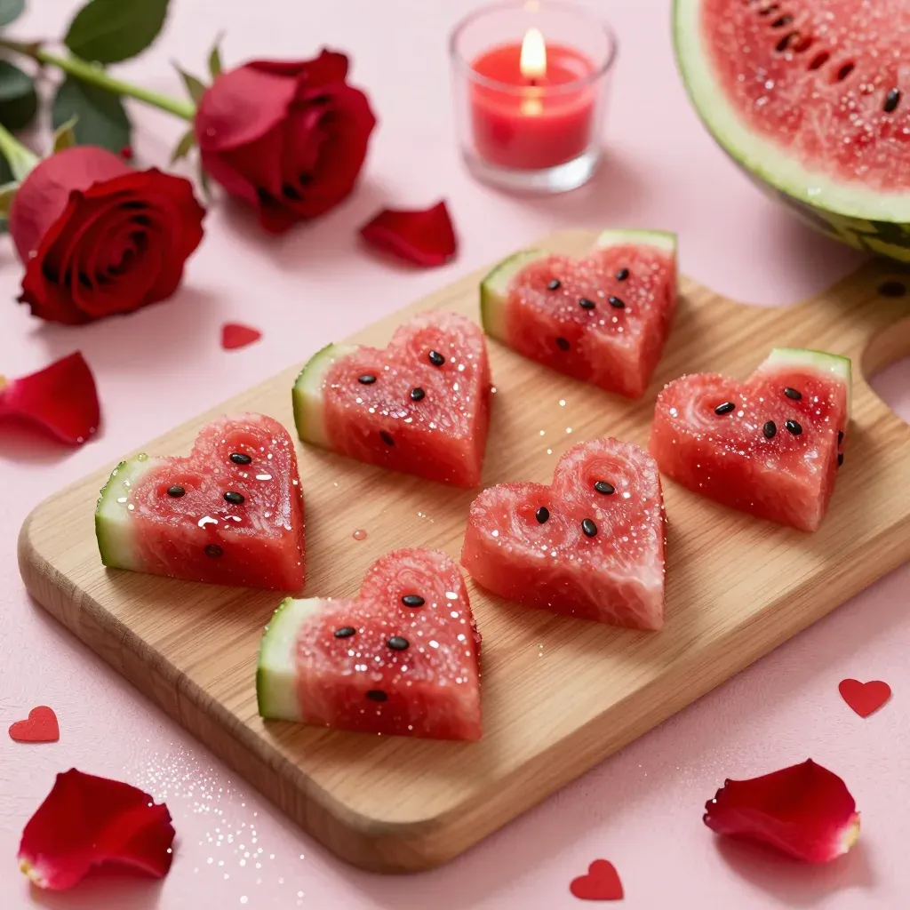 Soft, juicy heart-shaped watermelon slices are arranged on a wooden cutting board, glistening with sugar and illuminated by warm red candlelight, creating a romantic and inviting atmosphere. The slightly blurred background with rose petals and a red candle enhances the visual appeal and depth of field.