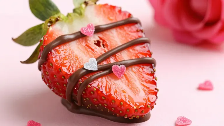 A juicy halved strawberry is adorned with glossy chocolate drizzle and tiny pink heart sprinkles, showcasing soft seedy flesh and a crisp green calyx. The soft front-lit glow highlights textures with shallow depth of field and negative space on the right for design integration.