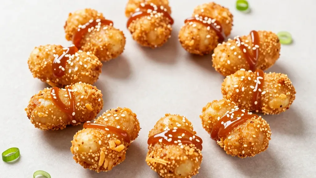 Golden-brown fried bite-sized snacks coated in coarse sesame seeds and drizzled with glossy caramel sauce, arranged in a circular pattern. Soft diffused lighting highlights the textures with shallow depth of field and a clean off-white background emphasizing the subject.