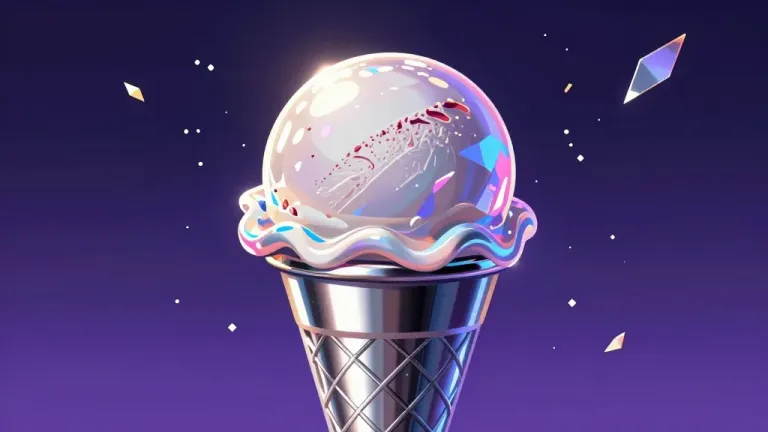 A crystal-clear sphere sits atop a melting ice cream cone, its facets reflecting light and colors. Soft, diffused lighting highlights the sphere's reflective surface and the glossy ice cream, creating a luminous effect against a deep purple background with glowing particles.