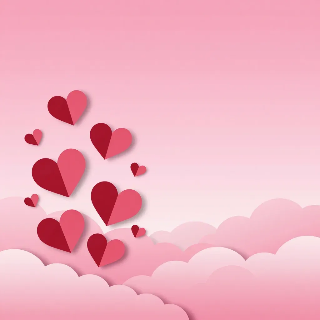 A cluster of hearts in various shades of red and pink, with a smooth, paper-like texture, softly lit with diffused, warm, and gentle shadows. The background is a soft gradient of light pink, blurred and out of focus, providing ample copy space.