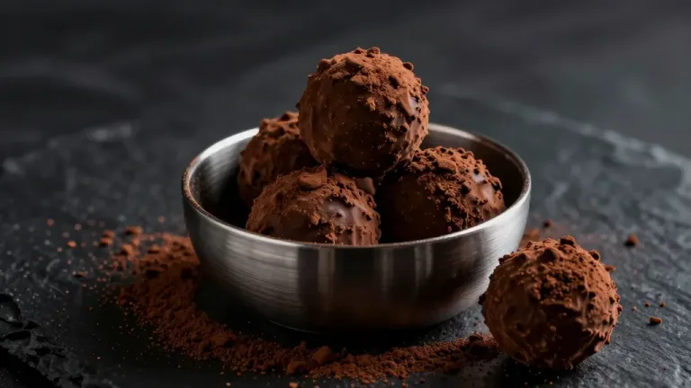 A glossy chocolate truffle is nestled in a metallic bowl, surrounded by a generous pile of cocoa powder, creating a rich, indulgent visual. Soft, diffused lighting highlights the truffle's texture and casts subtle shadows, enhancing the overall luxurious feel of the image.