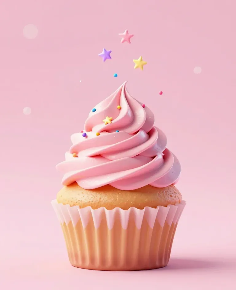 A close-up of a cupcake with glossy pink frosting and star-shaped sprinkles, softly lit to highlight its texture and details. The subtle pink background with a bokeh effect keeps the focus on the cupcake, creating a clean and elegant composition.