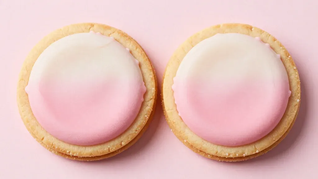 Close-up of round cookies with a smooth, glossy ombre glaze transitioning from white to pink, set against a soft, warm, directional light that highlights the texture and color gradient. The shallow depth of field and solid pink background emphasize the cookies, creating a clean and focused composition.