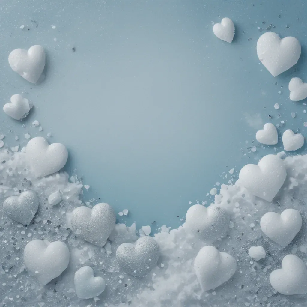 Soft, powdery heart-shaped sugar candies glisten against a pale blue background, creating a delicate frame with diffused, soft lighting that highlights their texture. The smooth, cool blue surface in the background slightly blurs, emphasizing the candies in the foreground, offering ample copy space for design elements.